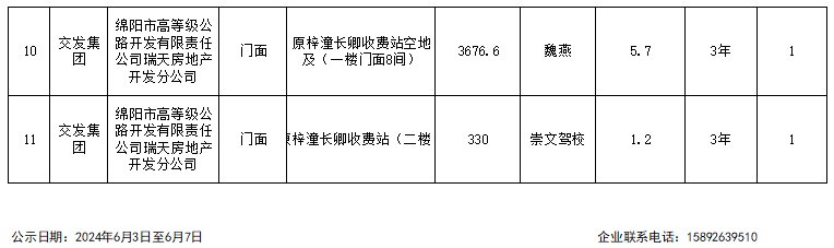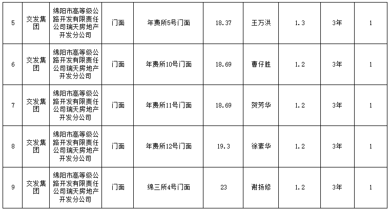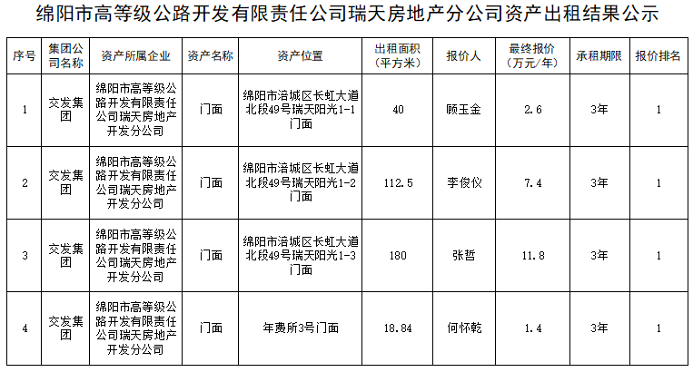 綿陽市高等級公路開發(fā)有限責(zé)任公司瑞天房地產(chǎn)分公司資產(chǎn)出租結(jié)果公示